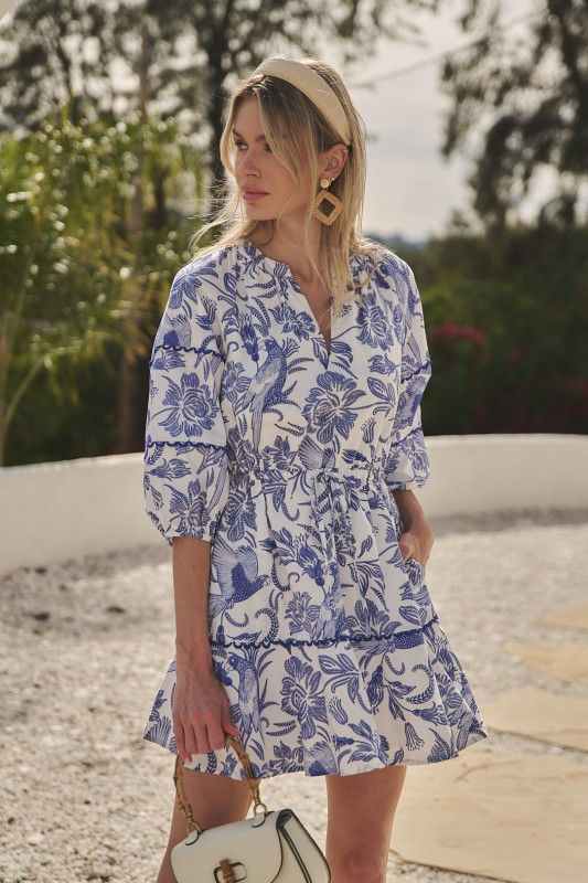 Womens Geo Print Tie Strap Tiered Smocked Dress